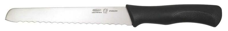 Nůž na chléb Mikov 57-NH-18 / Z je výborným společníkem do každé kuchyně pro krájení každého druhu pečiva, rychle a jednoduše rozkrojí chleba či rohlík či jiný druh pečiva, poradí si s každou kůrkou. Je certifikován pro styk s potravinami. Vyrobený v České republice, Mikulášovice. Má pevnou čepel se zoubkovanou hranou z nerezavějící oceli 420, s kónický / klínovitý výbrusem a vysokým ostřím. Ergonomicky tvarovaná rukojeť je z odolného černého plastu.