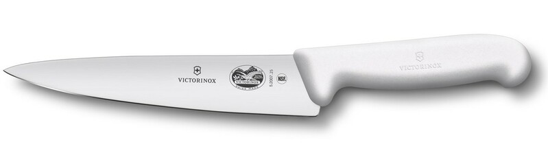 Kuchařský nůž s bílou fibroxovou rukojetí. Vynalezení plastové rukojeti Fibrox znamenalo pro Victorinox skutečný průlom. Je založena na nejmodernějších ergonomických poznatcích a uživateli poskytuje optimální ochranu. Všechny fibroxové rukojeti je možné sterilizovat až do teploty 150 ° C a odpovídají požadavkům směrnice (ES) 1935/2004.