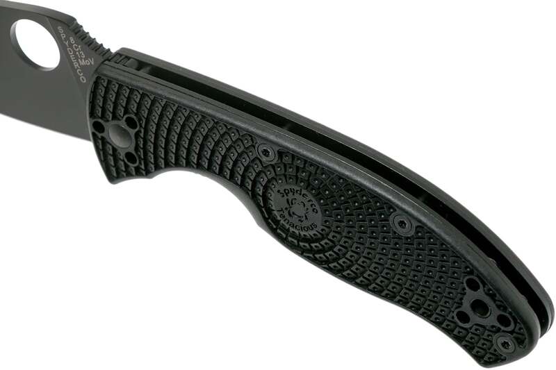 Rukojeť je z černého texturovaného FRN (nylon plněný skleněnými vlákny), s neklouzavým povrchem, dírkou na šňůrku a sponou na kapsy.
