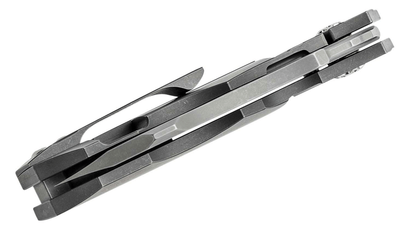 Design rukojeti: Rukojeť je vyrobena z titanu s tmavým stonewashed povrchem, který vyzařuje moderní a průmyslový vzhled. Přesné frézování zajišťuje ergonomický úchop, zatímco titanový backspacer zvyšuje strukturální integritu a přidává k estetické přitažlivosti nože. Robustní frame lock poskytuje bezpečný a spolehlivý provoz.