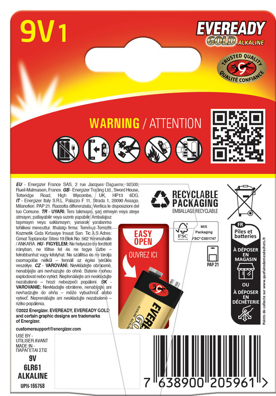E300705601 Energizer Eveready Gold 9V / 6LR61 FSB1