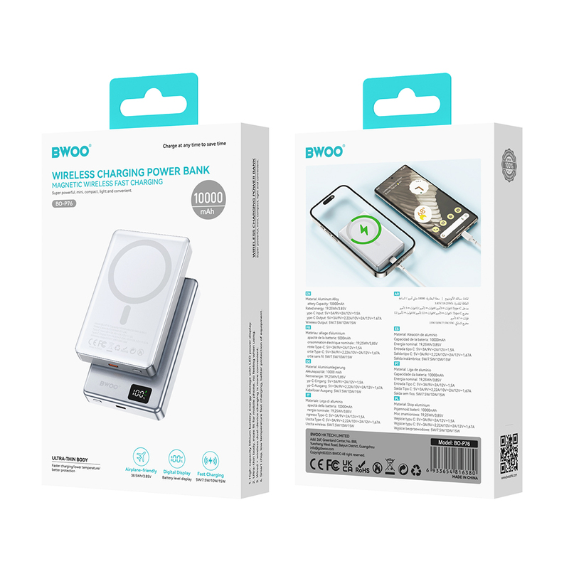 Ultratenká magnetická powerbanka BWOO P76 kombinuje elegantný, 9 mm hliníkový kryt s mimoriadnou ľahkosťou a prenosnosťou. Možno si ju ľahko strčiť do vrecka alebo tašky, čo z nej robí perfektného spoločníka na cestovanie. Kryt z kvalitnej kovovej zliatiny poskytuje minimalistický a moderný vzhľad.
