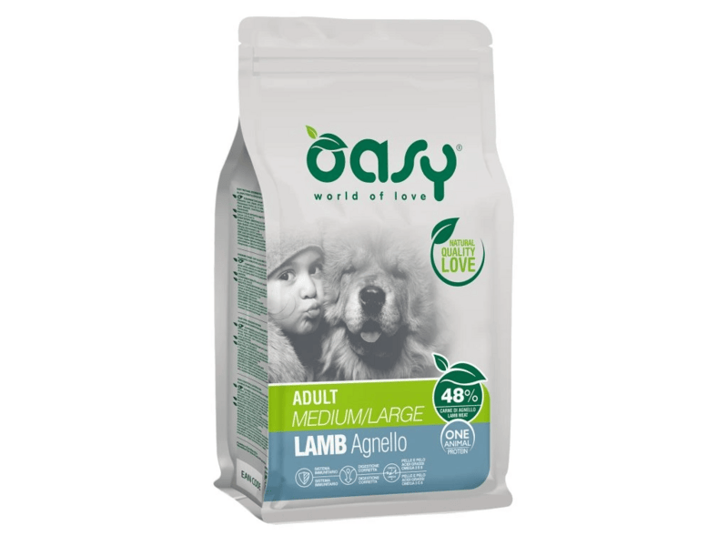 Kompletní suché krmivo Oasy One Animal Protein Adult Medium/Large Lamb 2,5 kg s 48% jehněčího jako jediným živočišným proteinem, ideální pro dospělé psy středních a velkých plemen s citlivým trávením nebo kůží. Bez GMO a sóji, obohacené o inulin, MOS a řepné řízky pro podporu zdravé střevní flóry.