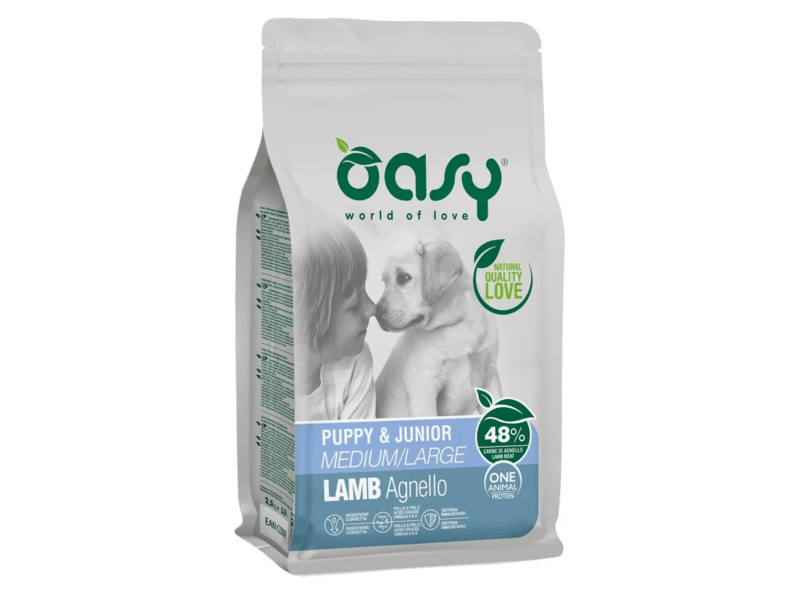 Monoproteinové krmivo Oasy One Animal Protein Puppy & Junior Medium/Large Lamb 2,5 kg s 48% jehněčího jako jedinečným živočišným proteinem, určené pro štěňata středních a velkých plemen do 18 měsíců. Bez GMO a sóji, navrženy pro citlivé trávení, zdravou srst a imunitu.