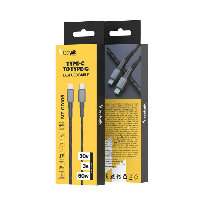 Opletený kabel Technik MT-CD105 USB-C/USB-C 20V 3A 1m Black je spolehlivé, odolné a vysoce výkonné řešení pro každodenní použití. Jeho opletený design poskytuje extra ochranu a delší životnost, zatímco PVC povlak zajišťuje flexibilitu a odolnost.