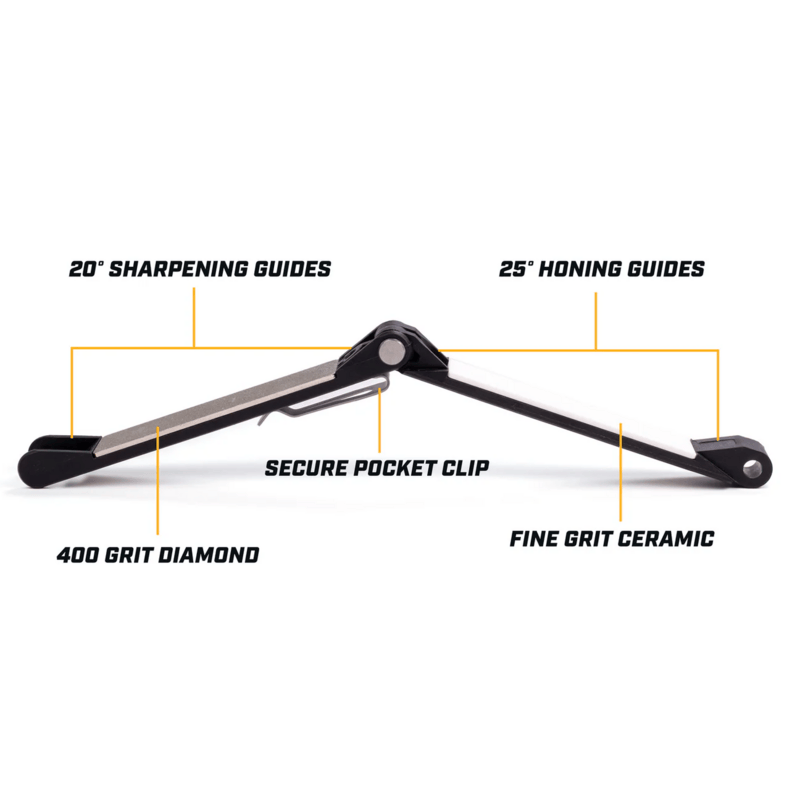 Skladacia búrska Work Sharp Folding Field Sharpener je ľahká, kompaktná a skladná, ktorú možno so sebou vziať kamkoľvek vďaka sklopnému dizajnu a vreckovému klipu.