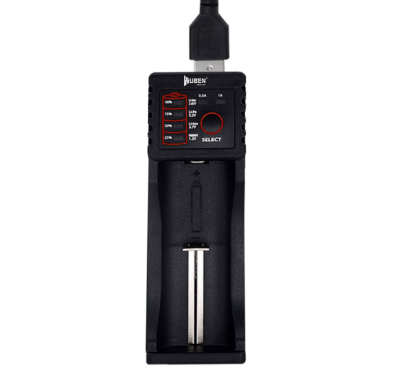 Jednopólová nabíječka Wuben One Bay Charger je inteligentní nabíječka kompatibilní s téměř všemi typy nabíjecích baterií, jako jsou Li-ion/IMR: 18650,18490,18350,17670,17500,16340 (RCR123), 1450,1AA.